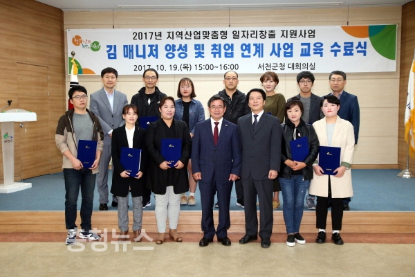 충남 서천군(군수 노박래)은 지난 19일 군청 회의실에서 지역산업맞춤형 일자리창출지원사업으로 추진한 ‘김 매니저 양성 및 취업 연계 사업’ 교육생 수료식을 가졌다.