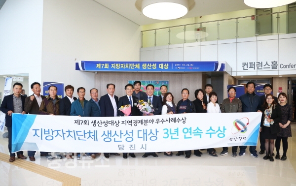 충남 당진시가 26일 여수세계박람회장에서 열린 제7회 지방자치단체 생산성 대상 시상식에서 우수사례부문 중 지역경제분야에서 우수사례로 선정되며 지난 2015년 이후 올해까지 3년 연속 수상이라는 쾌거를 달성했다.