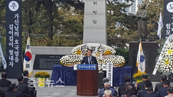 세현 아산시 부시장이 자유수호위령탑 앞에서 추도사를 낭독하고 있다.