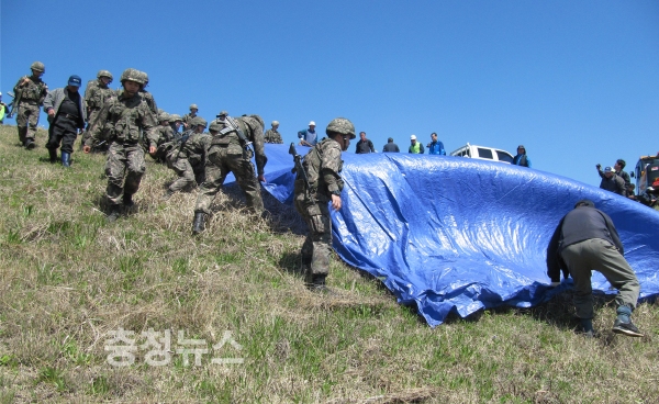 재난대응 안전한국훈련의 일환으로 무너진 저수지 제당에 방수포를 덮어 피해를 줄이는 훈련을 하고 있다