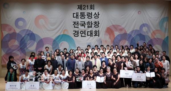 국의 30개 아마추어 합창단이 참가신청을 하였고 예선(동영상)심사를 통과한 16개의 팀이 지난 27일과 28일 양일간 한밭대학교 아트홀에서 열띤 경연을 펼쳤던 이번 제21회 대통령상 전국합창경연대회에서는 ▲대상(대통령상/ 1팀) 송파구립합창단 ▲ 최우수상(문화체육관광부장관상/ 1팀) 서초바우뫼여성합창단 ▲ 금상(대전광역시장상/ 1팀) 강동여성OB합창단