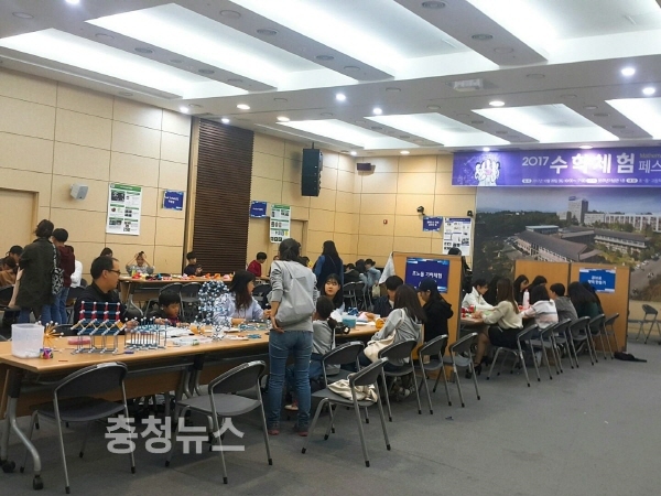 한남대 수학과 교수들과 재학생들이 기획하고 준비한 수학체험 페스티벌은 교수 강연과 ’만들기 교실‘ ’탐구 교실‘ ’게임 교실‘ 등 다양한 테마별 수학체험 부스가 운영됐다.