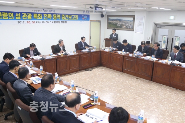 충남 보령시는 31일 오전 시청 상황실에서 김동일 시장과 관련 부서장, 배성식 이룸 경영연구소장, 자문위원 및 외부전문가 19명이 참석한 가운데 보령의 섬 관광 특화전략 용역 중간보고회를 가졌다.