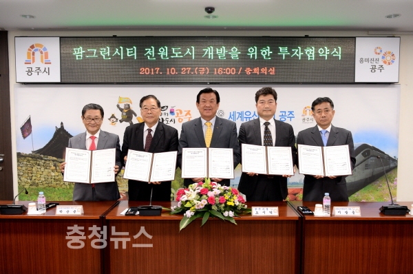 충남 공주시(시장 오시덕)가 전국의 전원생활 희망자를 대상으로 공주 전원도시(가칭 공주팜그린시티)를 개발하는 금강도시개발컨소시엄과 지난 27일 협약을 체결했다고 밝혔다.