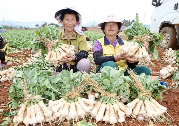 서산시에 따르면 고북면 가구리를 비롯해 초록리, 사기리, 정자리, 기포리 등의 지역의 80여개 농가들은 160ha에 심은 총각무를 수확하느라 바쁜 손놀림을 보이고 있다.