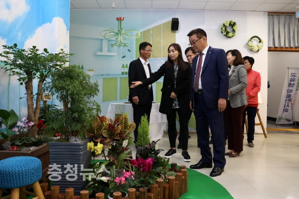 제13회 농업인대회에 계룡 최홍묵 시장이 원예활동 작품을 둘러 보고있다.