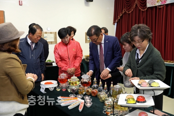 계룡시 농업인대회 쌀음식 전시를 둘러보고 있는 최홍묵 계룡시장 모습