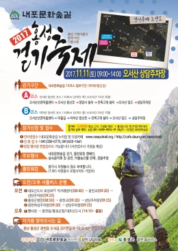 충남 홍성군은 이달 11일 가을억새가 절정인 오서산 초입의 광천 상담마을 일원에서 ‘홍성 거점마을과 함께 하는 가을소풍’이라는 주제아래 ‘내포문화숲길 2017 홍성걷기축제’ 가 열린다고 밝혔다.