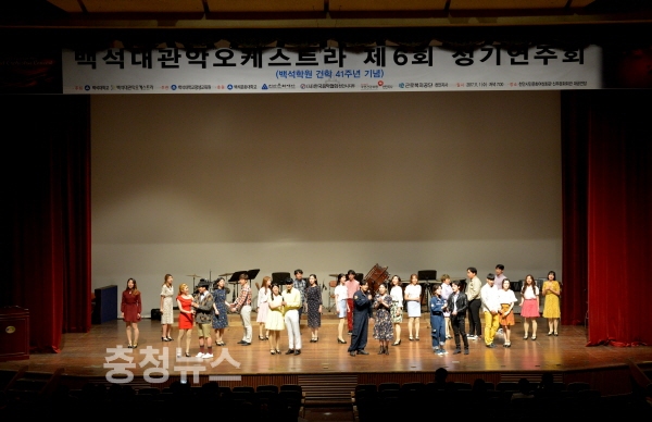 백석대관악오케스트라를 주축으로 구성된 이번 음악회는 백석대 재학생들로 구성된 백석대학합창단의 합창곡, 백석대 문화예술학부 뮤지컬전공 재학생들의 뮤지컬 ‘올슉업’ 등 다양한 프로그램으로 준비됐다.