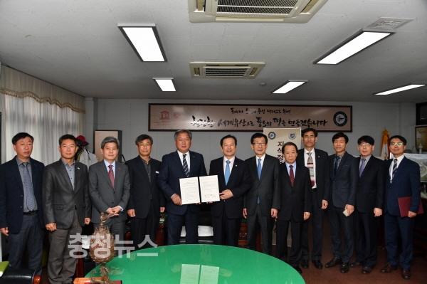 충남 부여군과 선문대학교가 2일 부여군청 군수실에서 이용우 군수와 황선조 총장 등 10여 명이 참석한 가운데 지식정보 교류를 위한 관·학 협약을 맺었다.