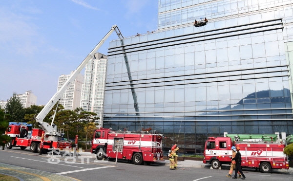 다중밀집시설에서의 지진재난발생을 가상으로 남부소방서, 중부경찰서,육군제1970부대5대대, 한국가스안전공사 등 8개 유관기관이 참여해 응급복구차량 및 인력을 동원하는 주민참여형 훈련으로 진행됐다.