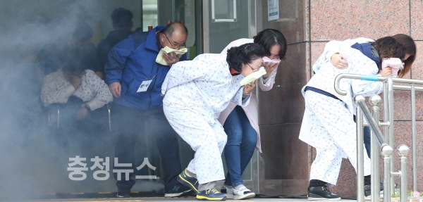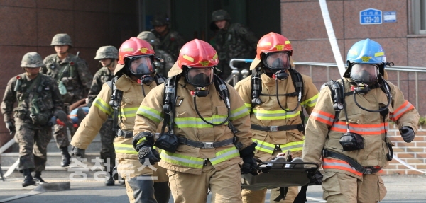 이날 훈련은 새봄요양병원 지하 1층에서 일어난 가스폭발에 의한 화재사고로 인명 피해가 발생한 상황을 가정해 비상대피, 화재진압, 인명구조 등이 펼쳐졌다.