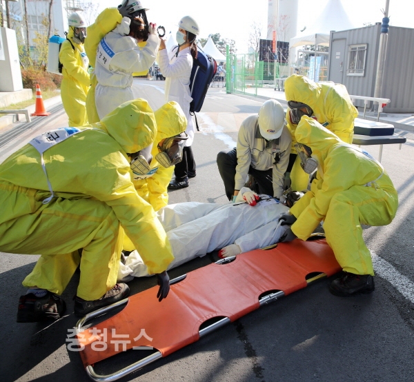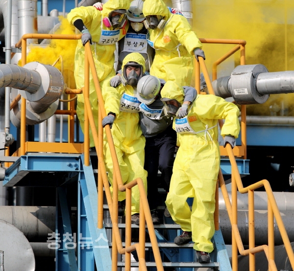 2일에는 원북면 인근 해상에 규모 6.5의 지진이 발생했다는 가상 상황을 설정, 원북면 태안발전본부 IGCC발전처에서 태안군을 비롯해 태안소방서 등 16개 기관·단체 관계자 257명이 참여한 가운데 인명구조와 화재진화, 후속조치 등 실전을 방불케 하는 현장훈련을 펼치며 굵은 땀방울을 흘렸다.