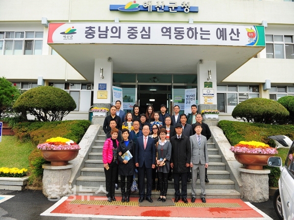 중국 요녕성 주요도시 여행관계자 팸투어 인원들이 예산군청 앞에서 단체사진을 찍고 있다