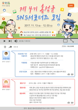 충남 홍성군은 오는 13일부터 12월 3일까지 홍성군정에 애정과 관심을 갖고 있는 SNS 운영자(운영예정자 포함)를 대상으로 SNS 서포터즈 20여 명을 모집한다고 6일 밝혔다.