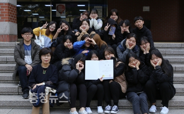 유아교육과 학생들이 제18회 전문대학 아동극 경연대회에서 대상 수상 후 기념사진을 찍고 있다.