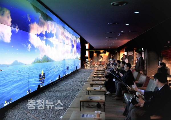특히 관심을 많이 보였던 스크린낚시 체험은 피싱조이의 가로 22.5m, 세로 2.5m 대형 파노라마형 스크린 화면을 통해 진행되었다.