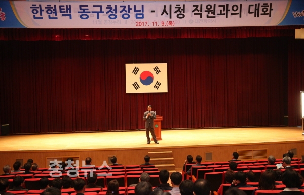 대전 동구(구청장 한현택)는 9일 대전시청 대강당에서 시청 직원 등 400여 명이 참석한 가운데 한현택 구청장과 시청 직원과의 대화를 개최했다.