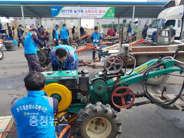 이번 농기계 수리봉사는 충남농협기술자협의회 회원과 농기계생산업체 기술자 등 50여명이 휴일까지 반납하고 이앙기, 경운기, 관리기, 예취기 동력분무기 등 소형농기계 200여대를 무상 점검·수리해 농가의 영농비 부담을 덜어 주었다.