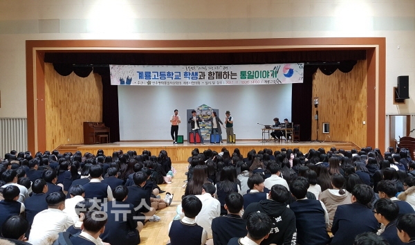 민주평화통일자문회의 계룡시협의회(회장 이지웅)는 10일 오후 계룡고등학교(교장 박상식) 강당에서 계룡고 학생 450여명을 대상으로 “계룡고등학교 학생과 함께하는 통일이야기”를 개최했다.