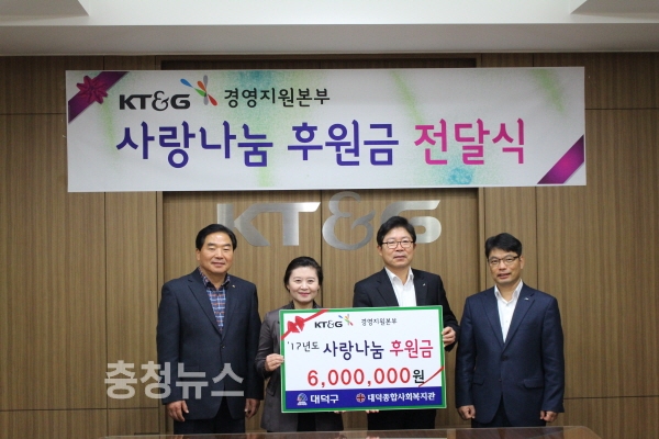 KT&G 경영지원본부(본부장 김용덕)가 지난 14일 대덕구 관내 저소득 가정을 대상으로 하는 장학금 지원과 사회복지관의 환경개선을 위해 대덕종합사회복지관에 후원금 600만원을 전달했다.
