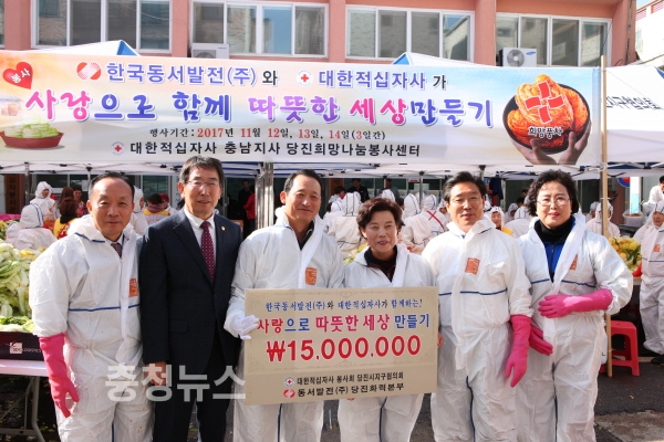 한국동서발전(주) 당진화력본부는 대한적십자사와 공동으로 지난 14일부터 15일까지 양일에 걸쳐 당진지구협의회 봉사관에서‘2017년 사랑의 김장 나눔’행사를 개최했다고 밝혔다.