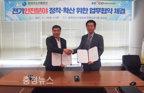 한국가스기술공사(사장 이석순) 전북지사(지사장 정민구)는 15일 전북지사 2층 회의실에서 한국전기안전공사 전북지역본부와 “가스 및 전기분야 안전문화 정착⦁확산 위한 업무협약”을 체결했다.