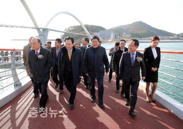 안흥나래교 개통식에서 다리를 건너고 있는 관계자들
