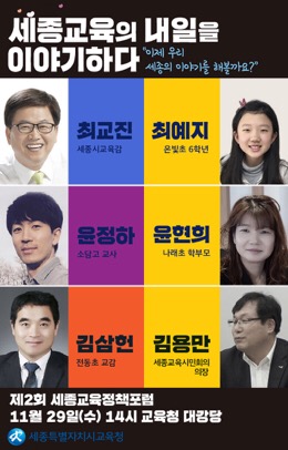 이후 순서는 세종시교육청 이주희 서기관이 ‘세종교육의 현황과 미래교육 발전 과제’를 주제로 발표하고, 이에 대해 5명의 토론자(학부모·교사·교감·시민·전문직)가 지정토론을 하게 된다.