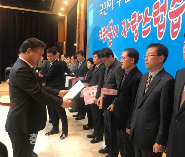 김부겸 행정안전부장관이 김성철 아산시 복지문화국장에게 표창 수여하고 있는 모습