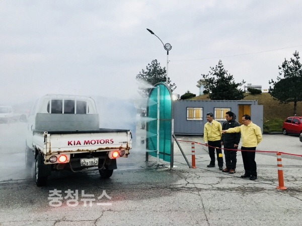 AI방역 총력 대응( (박여종 부군수가 소독시설을 점검하고 있다-오른쪽 첫번째)