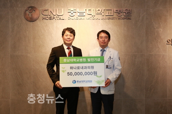 충남대병원(원장 송민호)은 연말을 맞아 하나로내과의원(원장 서지원·신재규·장준·백종태·신승훈·안영용)에서 충남대학교병원 발전기금(내과계열 발전기금) 5000만 원을 기부했다고 22일 밝혔다.