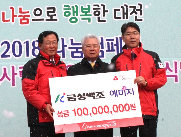 금성백조는 지난해 사랑의 온도탑 제막식에서 7000만 원을 기탁한데 이어 올해는 1억 원을 쾌척했다. 예미지 사랑나눔 봉사단은 연중 지속적인 사회 공헌 활동을 인정받아 지난 10월, 2017 나눔실천 유공자 포상 국무총리 표창을 받은 바 있다.