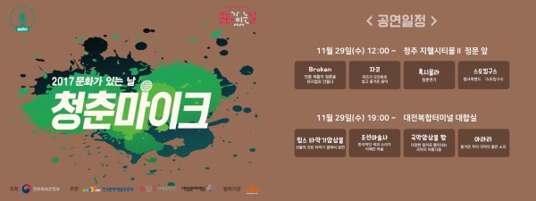 문화가 있는 날 ‘청춘마이크’사업은 문화체육관광부가 주최하고 문화가 있는 날 사업추진단과 대전문화재단이 주관하는 사업으로 각 지역에서 엄선된 청년예술가들을 대상으로 매달 마지막 주 ‘문화가 있는 날’무대에 설 수 있는 기회를 마련해 주는 사업이다.