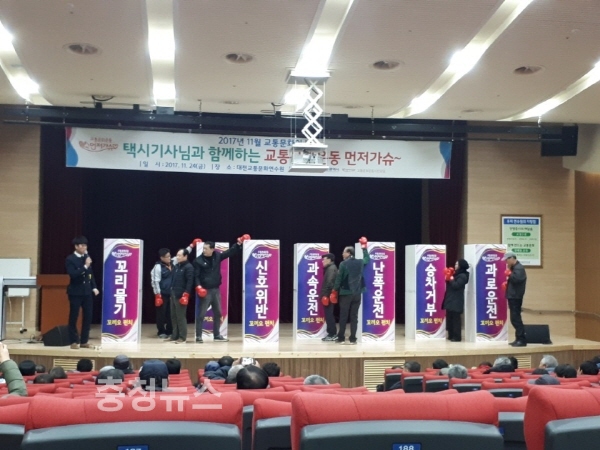 대전시는 24일 ‘11월 교통문화의 날’을 맞아 대전교통문화 연수원 다목적교육관에서 택시운전기사님과 함께하는 먼저가슈 교통문화운동 실천다짐 행사를 가졌다.