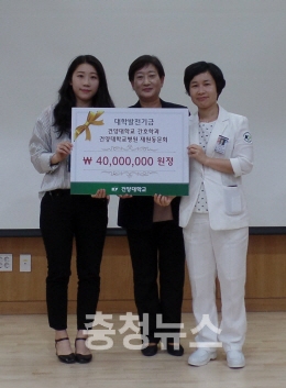 건양대는 23일 대전 메디컬캠퍼스에서 건양대 간호대학의 2회 졸업생이자 현재 간호대학 동문회장인 정수정 회장이 한수정 간호대 학장에게 발전기금을 전달하는 행사를 가졌다.