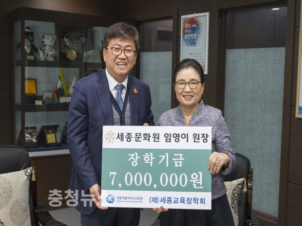 최교진 교육감(사진 왼쪽)과 세종문화원 임영이원장(사진 오른쪽) 장학금 전달식 장면