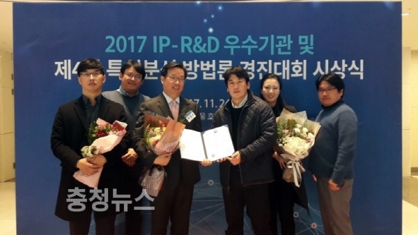 단국대가 지난 24일 르메르디앙 서울호텔에서 진행된 ‘지식재산(IP)-연구개발(R&D)우수기관 및 특허분석 방법론 경진대회 시상식'에서 우수기관으로 선정되어 특허청장상을 받았다. (왼쪽 세번째 단국대학교 현정근 교수)