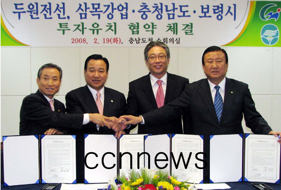 이완구 충남지사와 신준희 보령시장, 김상복 두원전선㈜ 대표, 송종섭 삼목강업㈜ 대표가 19일 충남도청 회의실에서 보령 관창산업단지에 전력케이블 및 자동차 스프링 공장 건립을 위한 투자협약(MOU)식을 가졌다.