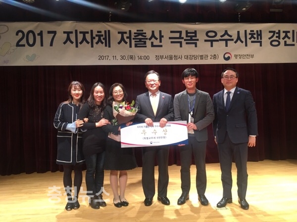 세종시(시장 이춘희)는 지난 30일 행정안전부 주관으로 개최된 ‘2017 저출산 극복을 위한 지자체 우수시책 경진대회’에서 우수상을 수상, 특별교부세 8000만 원과 국무총리표창을 수상했다.