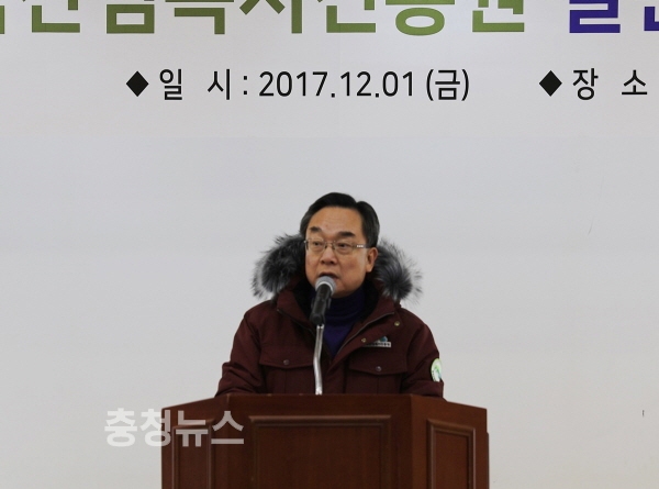 윤영균 한국산림복지진흥원장이 1일 충남 태안군 소원면 천리포수목원에서 개최된 '2017 열린혁신 한마당' 행사에서 인사말을 하고 있다.