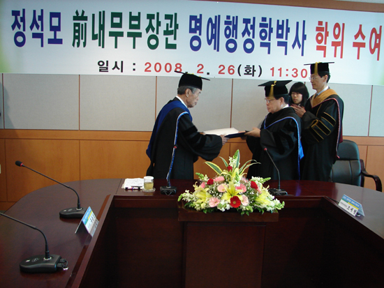 정진석 국회의원의 부친 정석모(79·사진) 전 내무부장관이 26일 11시 30분 건양대 명곡정보관에서 김희수 건양대학교 총장으로부터 명예 행정학 박사학위를 받았다.