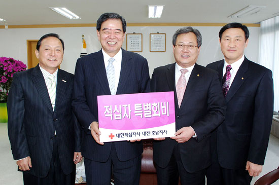대전시 중구(구청장 이은권)는 26일 구청장 집무실에서 2008 적십자회비 모금기간을 맞이하여 중구청장 특별회비(100만원)를 대전.충남적십자사(회장 박건영)에 전달함으로서 나눔문화 확산과 더불어 살아가는 사회분위기 조성에 기여하였다. (사진설명 : 좌측으로부터 신상헌 사무국장, 박건영 회장, 이은권 중구청장, 오현성 총무국장) 저작권자 © 충청뉴스 무단전재 및 재배포 금지 한중섭 기자 다른기사 보기 기사가 마음에 드셨나요? 충청뉴스 좋은 기사 후원하기 1,000원 3,000원 5,000원 10,000원 30,000원 50,000원 직접입력 비회원 약관동의하기 ※ 소중한 후원금은 더 좋은 기사를 만드는데 쓰겠습니다.