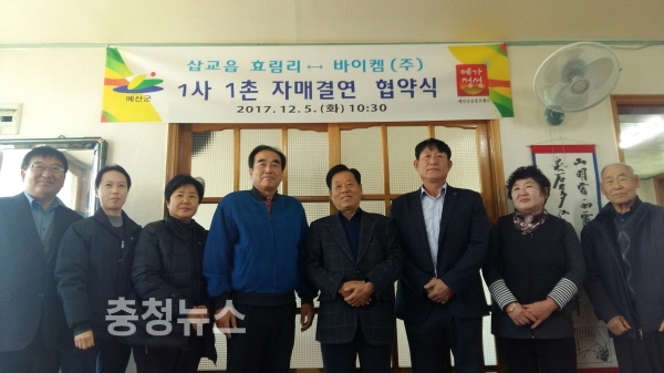 충남 예산군은 5일 예산일반산업단지에 위치한 바이켐㈜(대표 이범환)와 삽교읍 효림리(이장 장동선)가 마을발전을 위한 1사 1촌 자매결연을 체결했다.