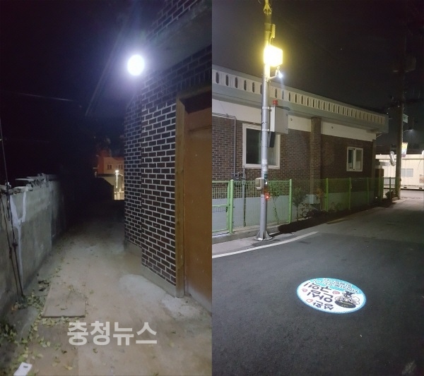 (좌) 골목길 센서등 설치 (우) 로고젝터 설치 모습