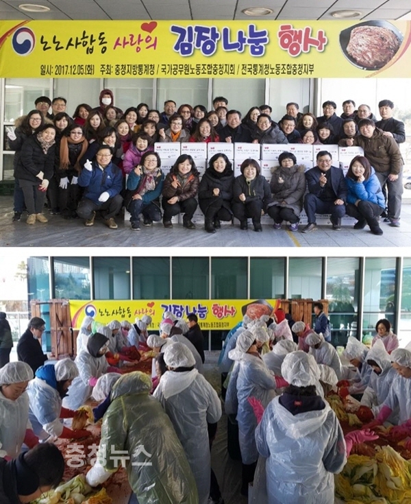 충청지방통계청(청장 진찬우)은 각 부서에서 사랑의 연탄배달, 봉사활동 등을 일상생활에서 실천하고 있는 가운데 5일에는 충청지방통계청 국가공무원노동조합과 전국통계청노동조합 합동으로‘노노사 합동 사랑의 김장나눔 행사’를 실시했다.