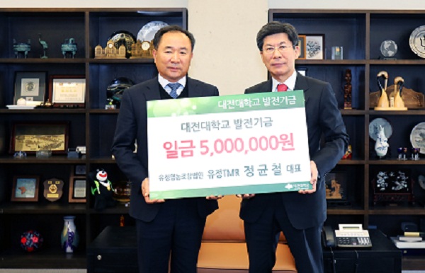 대전대는 5일 유정 TMR(혼합사료) 정균철 대표로부터 500만 원의 대학 발전기금을 전달받았다.