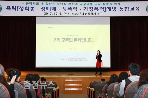대전 서구(구청장 장종태)는 지난 6일 구청 대강당에서 직원 400여 명을 대상으로 ‘성희롱․성매매․성폭력․가정 폭력’ 교육을 했다고 밝혔다.