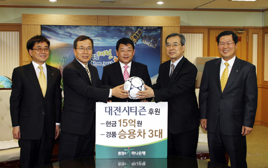 하나은행 충청사업본부 최임걸 대표는 10일 오후 대전시청을 방문, 대전시티즌 구단주인 박성효 시장과 송규수 대전시티즌 사장이 참석한 가운데 2008년도 대전시티즌 후원금 15억원과 관중 경품용 승용차 3대를 전달했다.