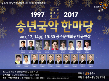충남 공주시충남연정국악원이 오는 14일 공주문예회관 대공연장에서 ‘송년국악한마당’ 정기연주회를 개최한다고 밝혔다.